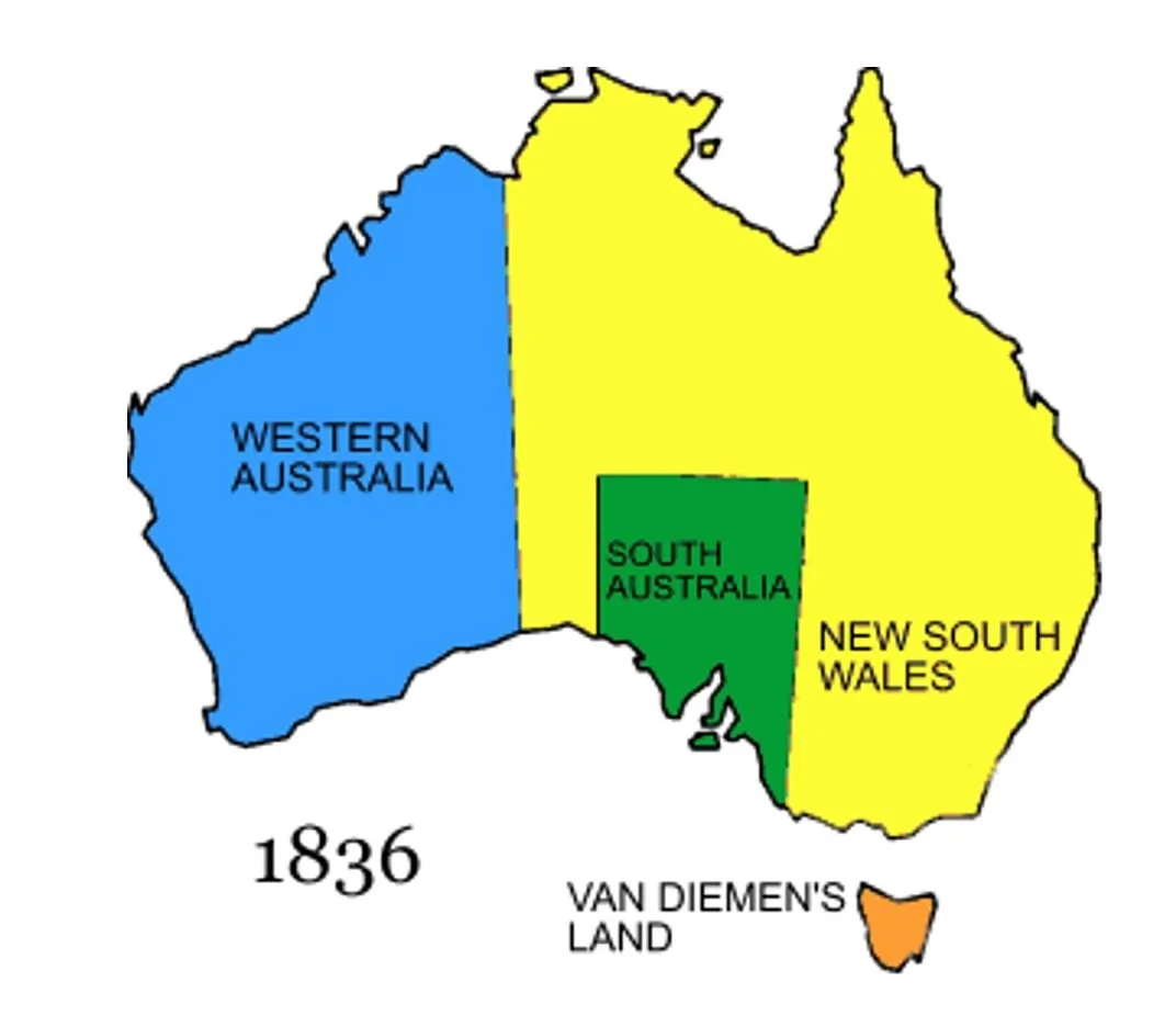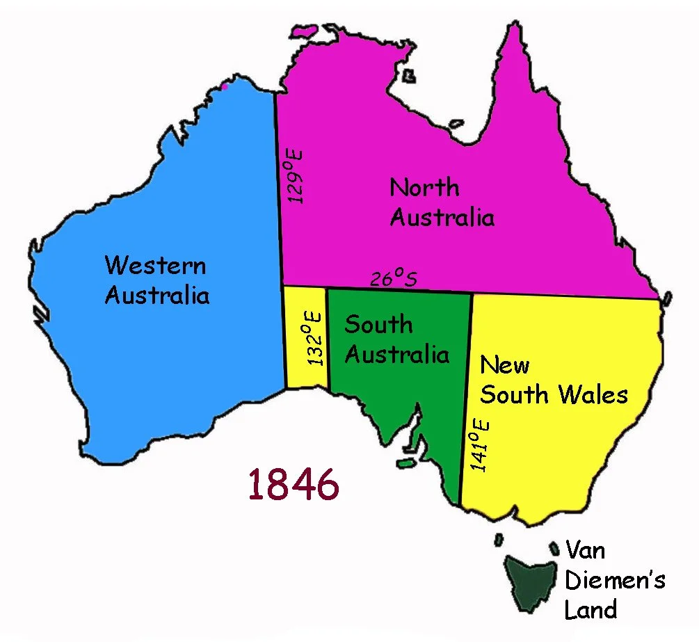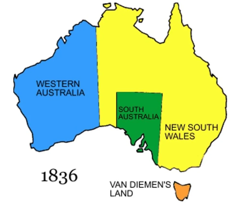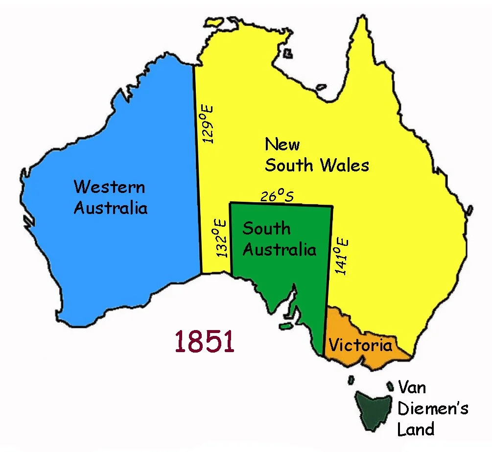 2nd May 1829 the Swan River Colony was declared which was updated to Western Australia on 6th February 1832 | The colony of South Australia was proclaimed 28th Dec 1836 with the western border set at 132° E