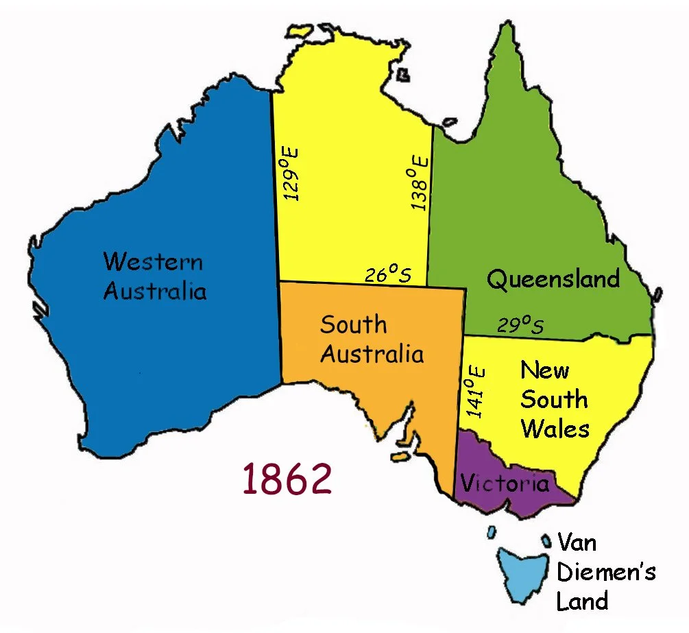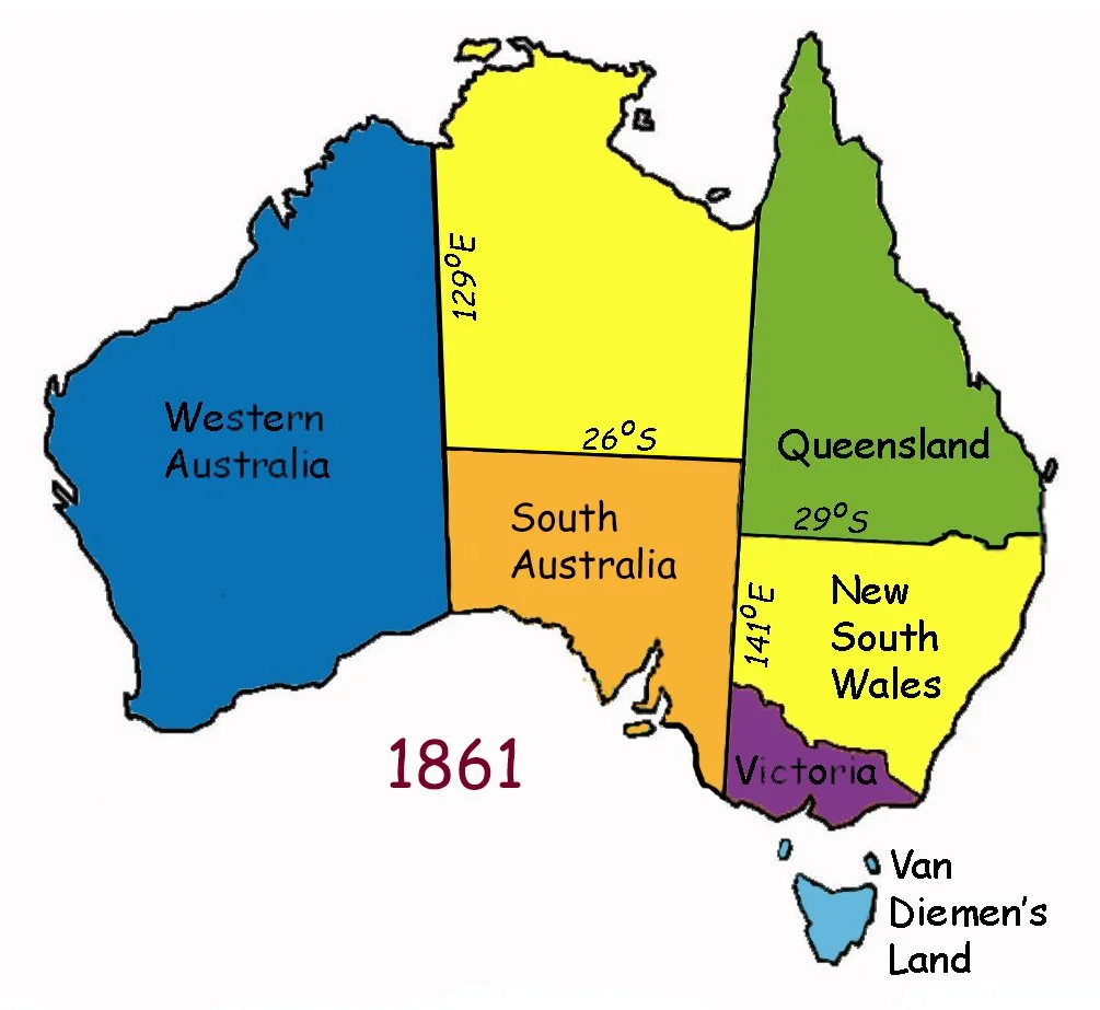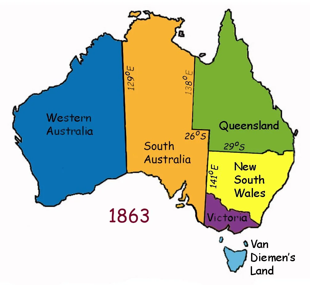 2nd May 1829 the Swan River Colony was declared which was updated to Western Australia on 6th February 1832 | The colony of South Australia was proclaimed 28th Dec 1836 with the western border set at 132° E